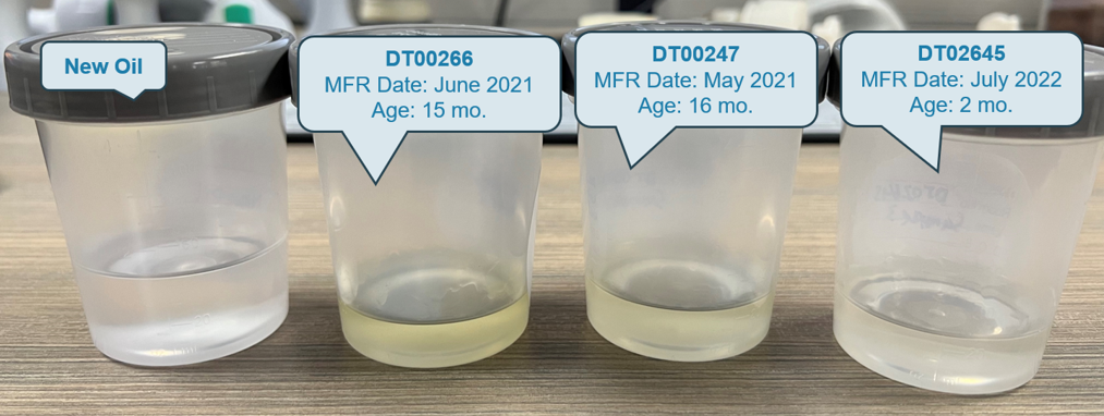 This chromatogram compares new mineral oil from the manufacturing floor with samples from three scan modules containing yellowed oil. Four distinct peaks—absent in the new oil—indicate contaminants that diffused into the mineral oil. The most prominent peak, at around 11 minutes retention time, corresponds to dioctyl terephthalate (DOTP), a common plasticizer in nitrile rubbers. The remaining three, smaller peaks also represent phthalate plasticizers, differing in molecular structure by chain length and phenyl group positioning.